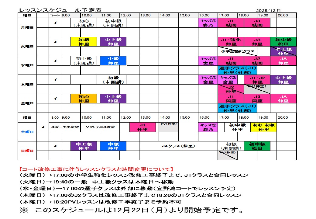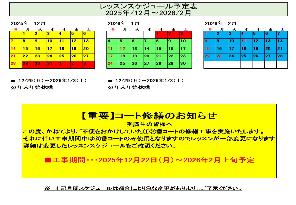 【2025年12月よりレッスンスケジュール変更について】 会員の皆様へ いつもご利用ありがとうございます。 月間スケジュールでもお知らせしたように12月22日より2月上旬までの間、コート修繕工事がはじまることとなりました。 その間、誠に勝手ながらレッスンスケジュールを一部変更させて頂きます。 工事期間中はごご不便をおかけし申し訳ございませんが、ご理解とご協力のほどよろしくお願いいたします。 ご不明な点がございましたら何時でも窓口までお問い合わせくださいm(__)m