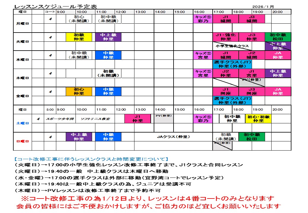 その間、誠に勝手ながらレッスンスケジュールを一部変更させて頂きます。